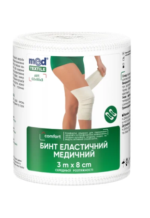 Бинт еластичний медичний середньої розтяжності 4 м х 8 см Med textile Розмір: 4 м х 8 см Профілактика і лікування травм або хвороб верхніх і нижніх кінцівок: варикозної хвороби, хронічних венозних запальних процесів в до- і післяопераційні періоди, попереджає виникнення тромбофлебіту поверхневих і тромбозу глибоких вен. Накладення бинта для профілактики або лікування травм і захворювань суглобів (артрити, артрози, слабкість зв'язкового апарату), знімає навантаження з пошкодженого суглоба, фіксує, зігріває, знімає набряклість, припиняючи розвиток запальних процесів. Захищає від травм під час занять спортом, важкої фізичної роботи, при тривалих статичних навантаженнях. Характеристики: Міцний матеріал бинта зберігає требуюмую еластичність і забезпечує відмінну компресію навіть після тривалого використання і багаторазового прання Високий вміст бавовни забезпечує комфорт при використанні бинта Для фіксації комплектується металевими або комбінованими кліпсами