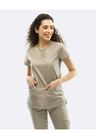 Костюм жіночий. Фігурний виріз горловини застібається на дві перламутрові кнопки. Талія оформлена декоративною обшивкою, що переходитиме у гумку на спині. На нижній частині пилочки розміщено дві накладні кармани, З внутрішньої сторони обшивка на спині декорована високоякісною принтованою тканиною. Штани прямого крою з двома накладними карманами. Пояс на штанах регулюється резинкою та тасьмою.