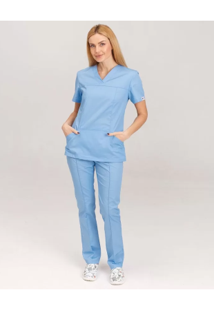 Костюм жіночий. Куртка напівприталеного силуету з поясом-зав'язкою контрастного кольору на талії. V-подібний виріз горловини та манжети також декоровані тканиною контрастного кольору. На нижній частині пилочки, спреду, є дві накладні фігурні кармани та розрізи по бічних швах. Рукав короткий. Штани завуженого крою з двома передніми накладними карманами. Пояс регулюється резинкою. Тканина: голландський котон, медичний бавовна преміум якості (Нідерланди). Склад: 65% поліестер, 35% хлопок. Щільність: 164 г/м2.